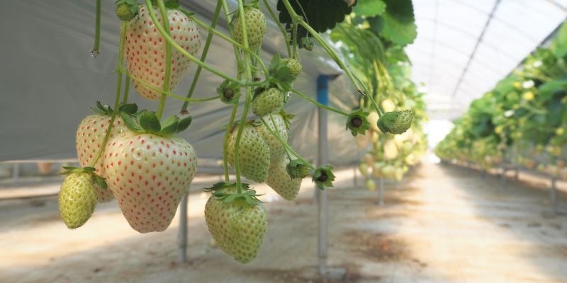 ミルクのように白いいちご「ミルキーベリー」は、酸味が少なく、独特のまろやかな食感と甘さが特徴です。
